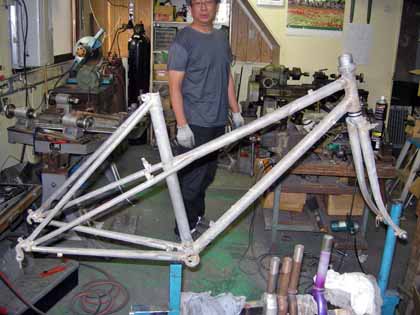 | 橋口製作所 所在地 :〒537-0002 大阪市東成区深江南2-11-18 電話 06- 7178- 6224 ビルダー :橋口 清 ブランド名 :エクター・プロトン(Extarproton) 橋口氏は、八尾にある田畑サイクルのメンバーで、レースにもよく出られ、私が所属していた寺内レーシングと 重なり合うメンバーが多かったため、合同で練習する機会も多数あった。 いつ頃か?忘れたが、琵琶湖一週(右回り)で初めて一緒に走った記憶がある。 当時、関西サイクルスポーツセンターが開業し、アマチュア専用のバンクも出来て、競輪でない自転車競技が浸透し出した頃、 大阪では、ズノーレーシングを筆頭にたくさんのクラブチームがあった。 そのためロード競技だけでなく、ピスト競技も盛んに行われた。 一緒に出る競技種目もあり、競技場では、いつもお世話になった。 さて、ビルダーとして、 ![]() 主にクロモリフレームが多いが、 アルミフレームも、手がけています。 工房の中は、溶接機や定盤、旋盤、切断機等があり、 オーダーフレームに対応してます。 また、フレームの修理等にも対応してもらえるので 助かります。 数年前に、ランドナーのフレーム修理をしてもらい、 大満足でした。 また、昔の自転車をよくご存知で、乗っている本人より、 詳しく、チネリのフレーム塗装をお願いした時、 出来上がりは、バッチリでした。 制作中の図面 ↓ ![]() 図面に自分の思いを書いて 世界にオンリーワンのフレームを 作ってもらうのもええかなぁ〜 ![]() ← フレームの固定治具 調整がスムーズに出来るように うまく出来ている。 ![]() → ミキストフレーム いろいろなタイプの自転車が 守備範囲の様です。 ![]() 変わったラグが? ランドナー修理の時は、 元々、ボカマのラグだったのが ナベラグに変えてもらった。 昔からのラグを持ってるのが素晴らしい。 関西のビルダーは、関東に比べて情報が少ないが 知識、技術、共に高いと思う。 |